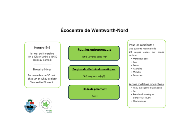 Les résidents de la municipalité peuvent disposer gratuitement, sur preuve de résidence, de tout matériau recyclable accepté à l’écocentre.