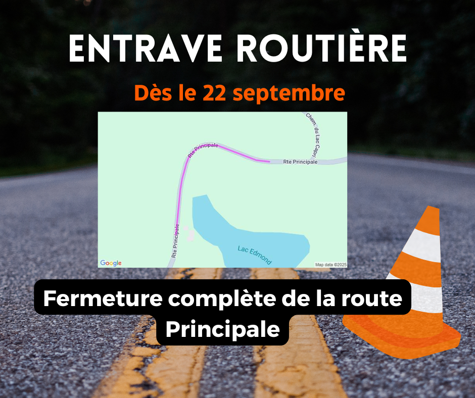 Des travaux de reconstruction d’un ponceau auront lieu sur un tronçon de la route Principale. Ces interventions entraîneront la fermeture complète de la route Principale à la hauteur du ponceau.