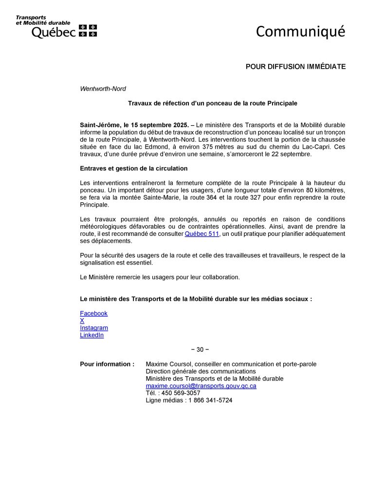 Communiqué officiel du MTQ- Travaux de réfection d’un ponceau de la route Principale